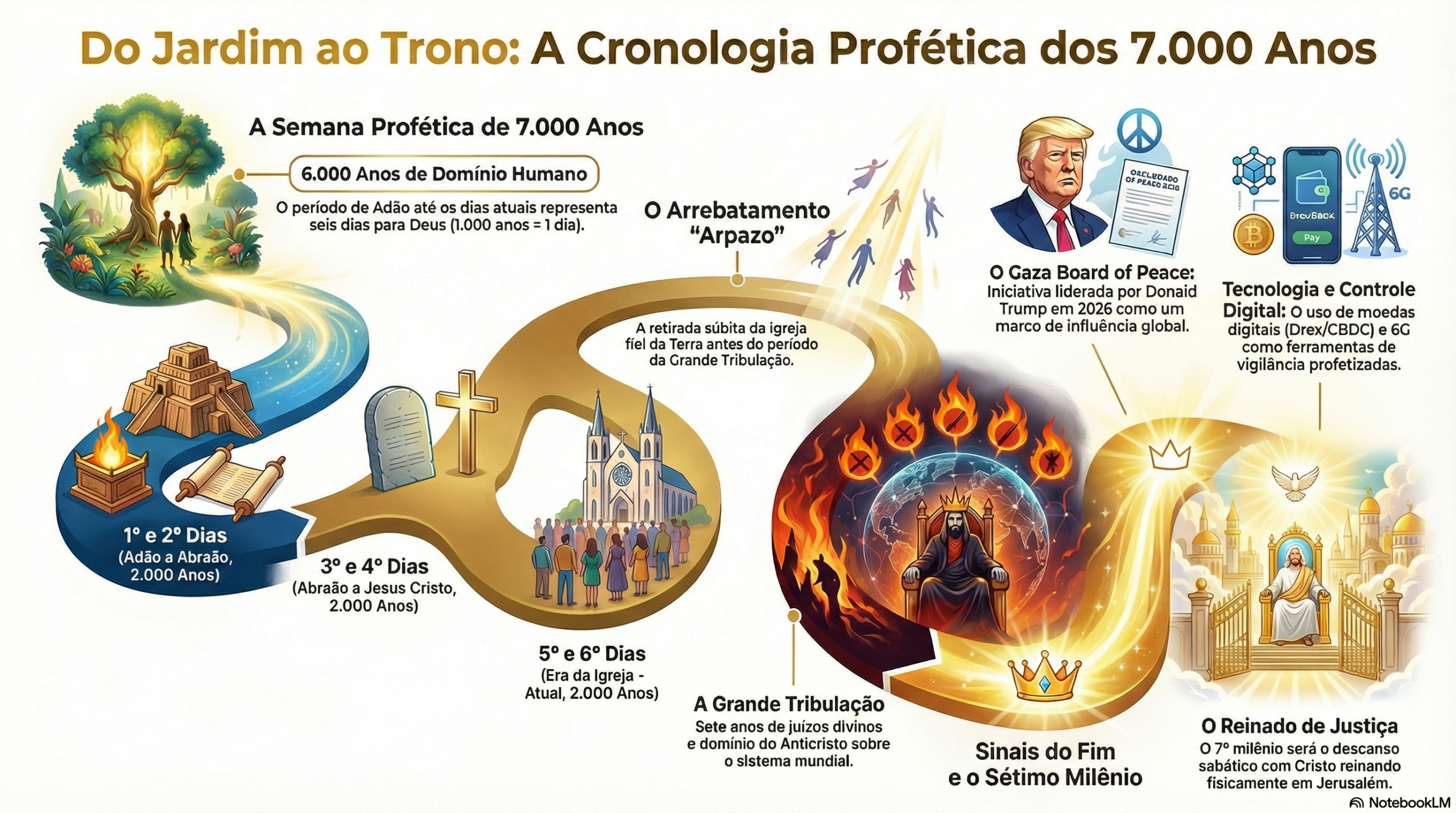 No centro deste relógio está Israel. O retorno dos judeus à sua terra em 1948 foi o despertar do ponteiro das nações, cumprindo Isaías 66:8 e inaugurando a geração de transição. Se observarmos a história humana sob o prisma dos sete milênios — onde um dia para Deus equivale a mil anos — a cronologia torna-se urgente. Do Éden a Abraão, de Abraão a Jesus e de Jesus à atualidade, percorremos seis dias de trabalho criativo e humano. Estamos agora no “amanhecer do terceiro dia” desde Cristo; o crepúsculo do sexto dia desde Adão. Somos a geração destinada a presenciar a inauguração do Sétimo Milênio: o Reino Messiânico.